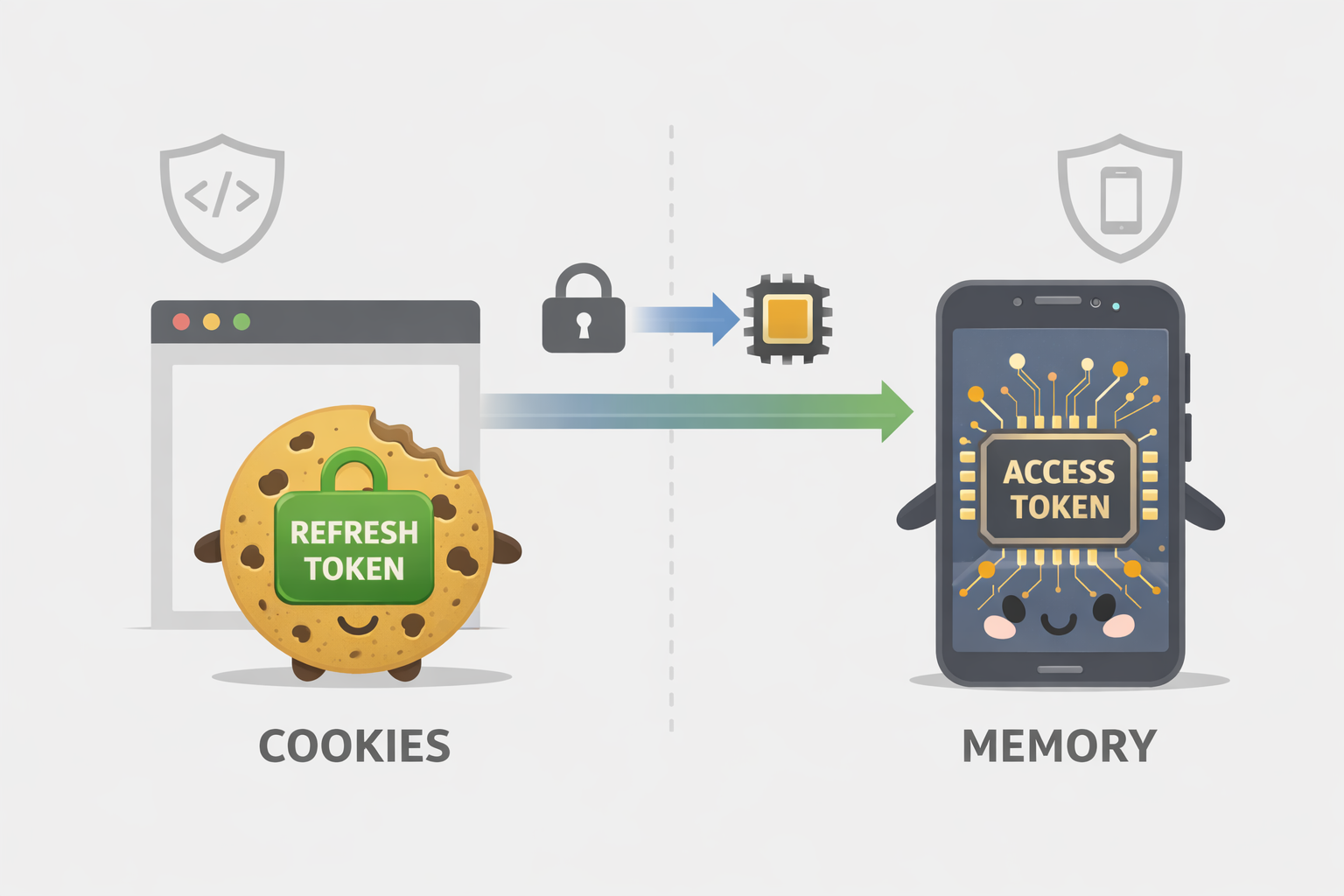 Refresh Token은 HttpOnly 쿠키로 보호하고, Access Token은 메모리에만 두어 빠르게 사용하고 폐기한다. 이 구조는 보안과 UX의 균형을 맞추며, 웹과 앱(WebView/모바일) 모두에 적합한 현실적인 인증 전략이다.